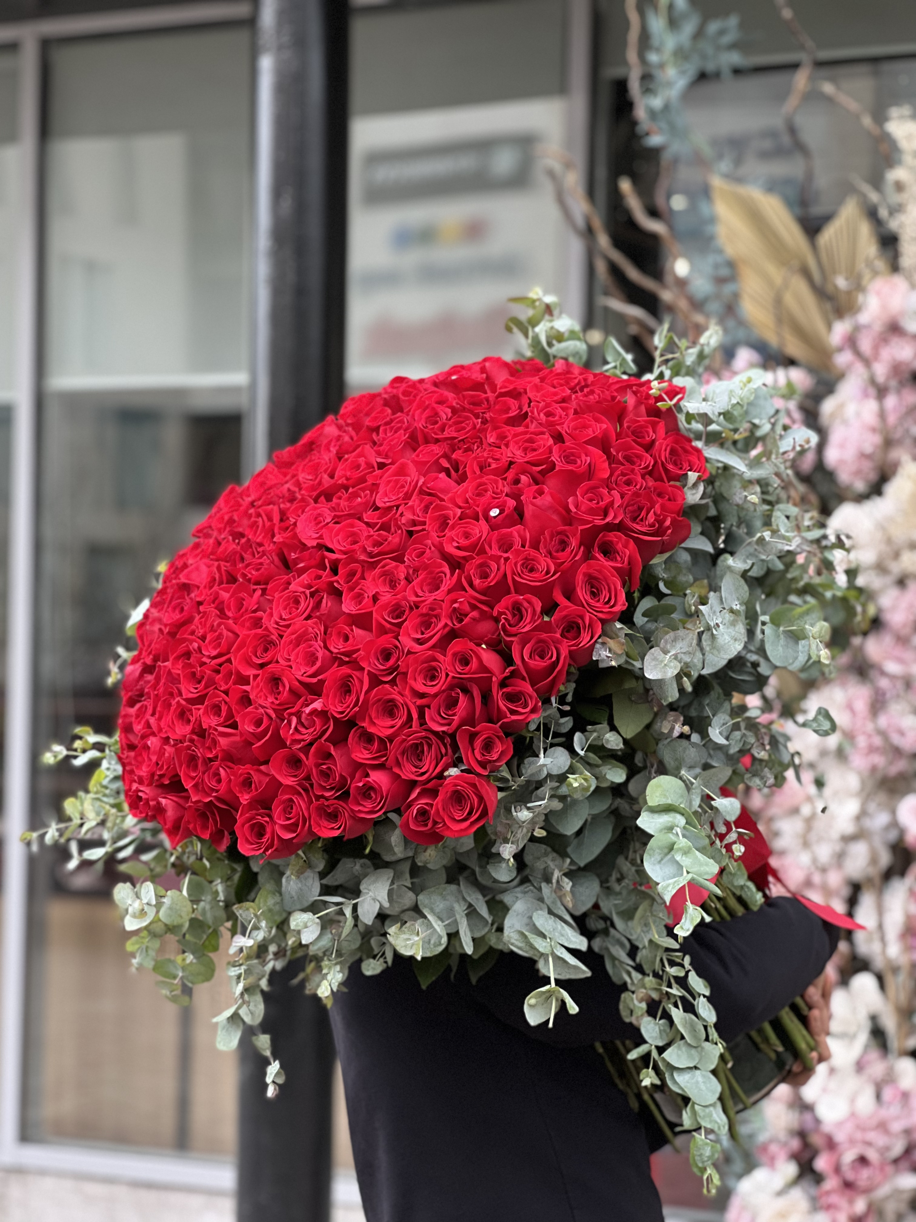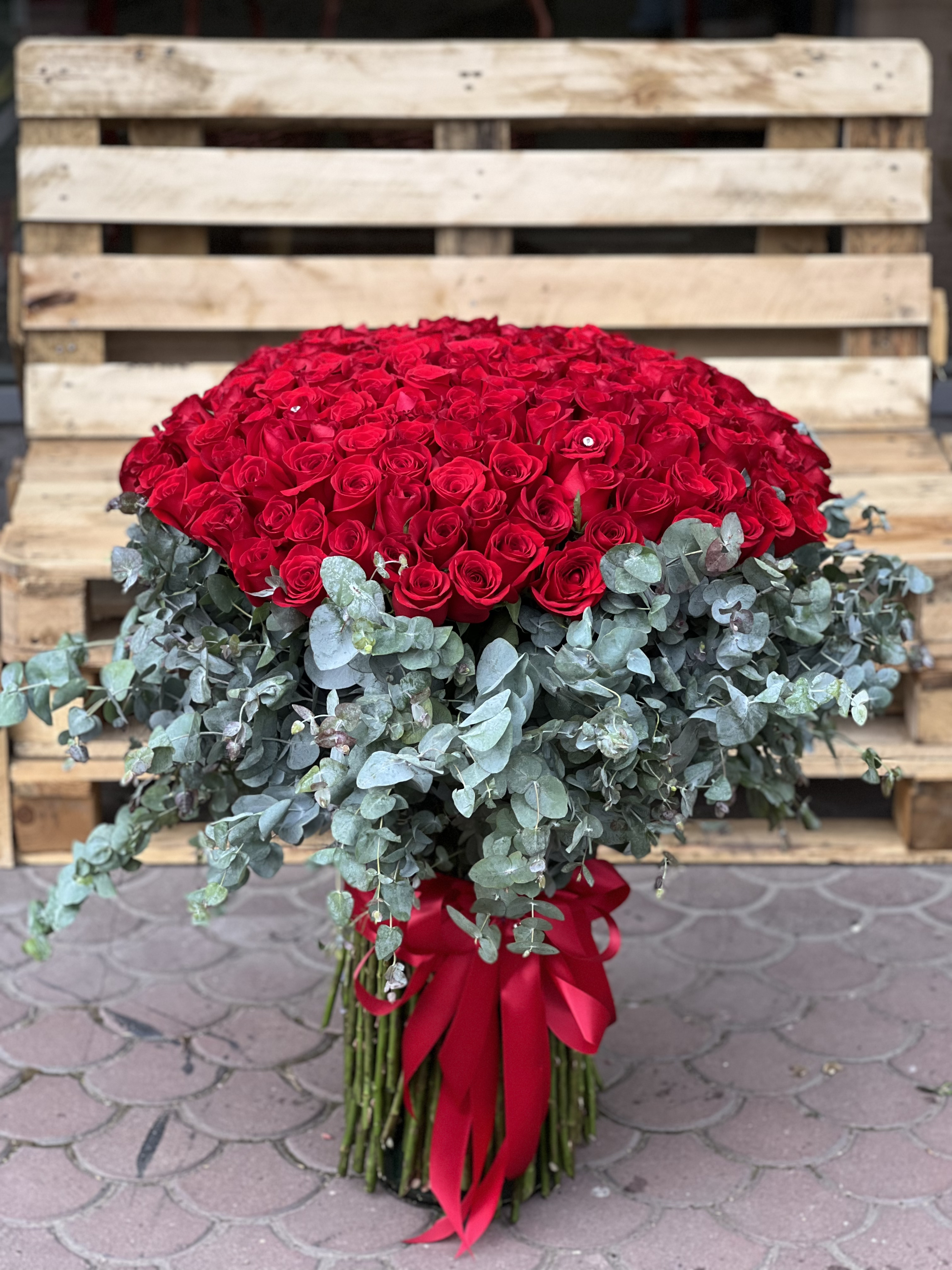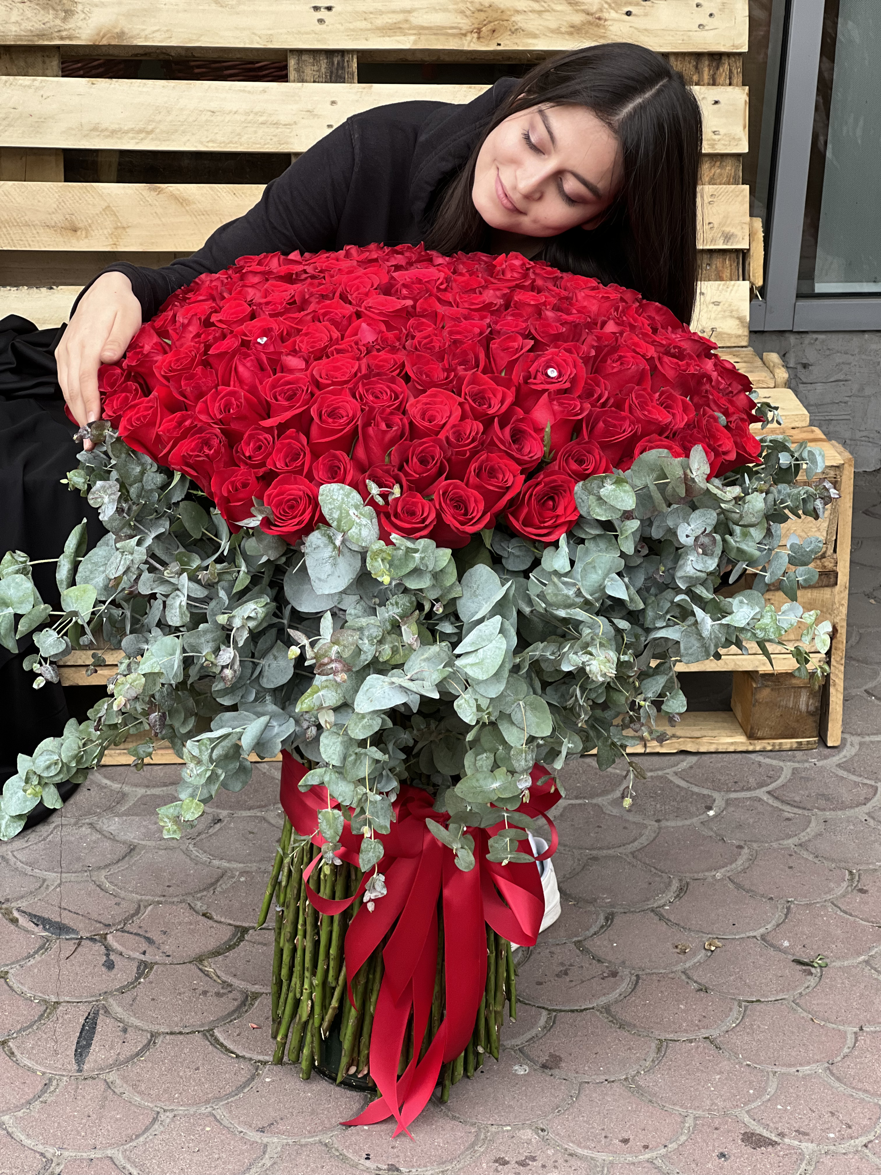 Роза голландская 100 см (+90 см) - 201; Эвкалипт (Голландия) - 30; Ваза прозрачная - 1; Шпажка для открытки - 1;