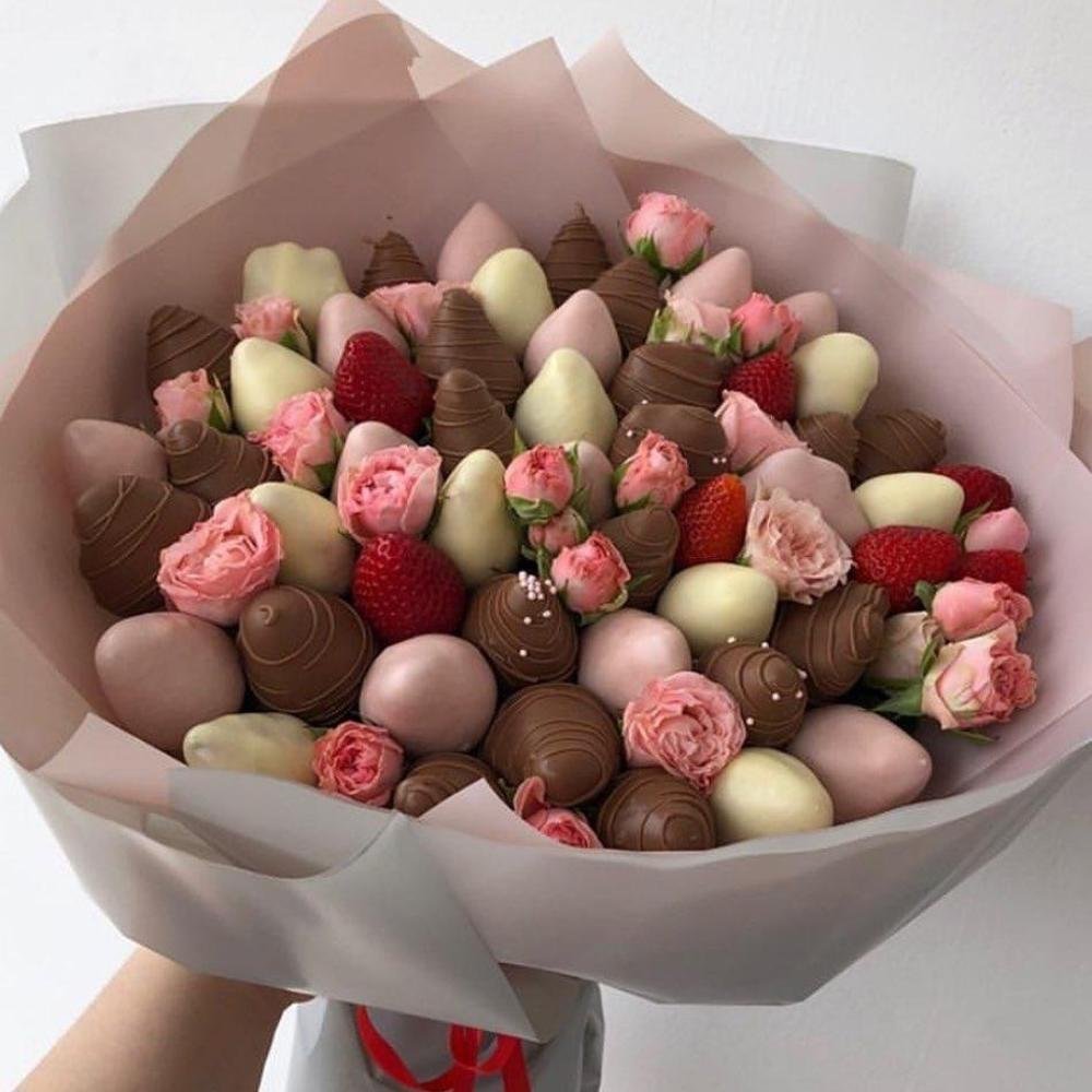 Прекрасный букет для признания своих тёплых чувств! С добавлением спрей роз, свежей клубники и и клубники в шоколаде.