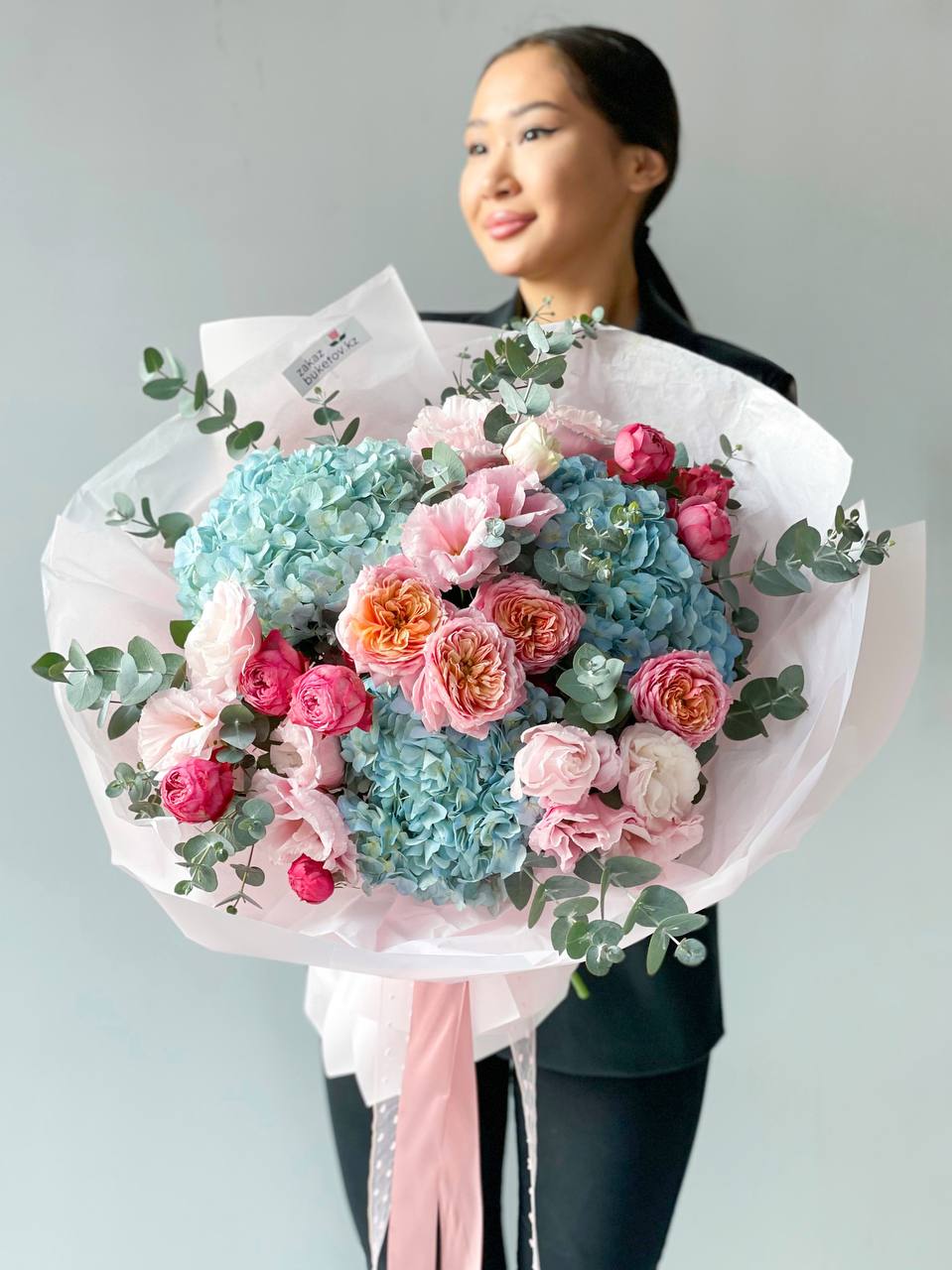 Чудесный яркий букет из эвкалипта, гортензий, лизиантусов и спрей роз. Если Вы хотите подарить незабываемые эмоции дорогому человеку — закажите доставку цветов в Zakazbuketovkz
