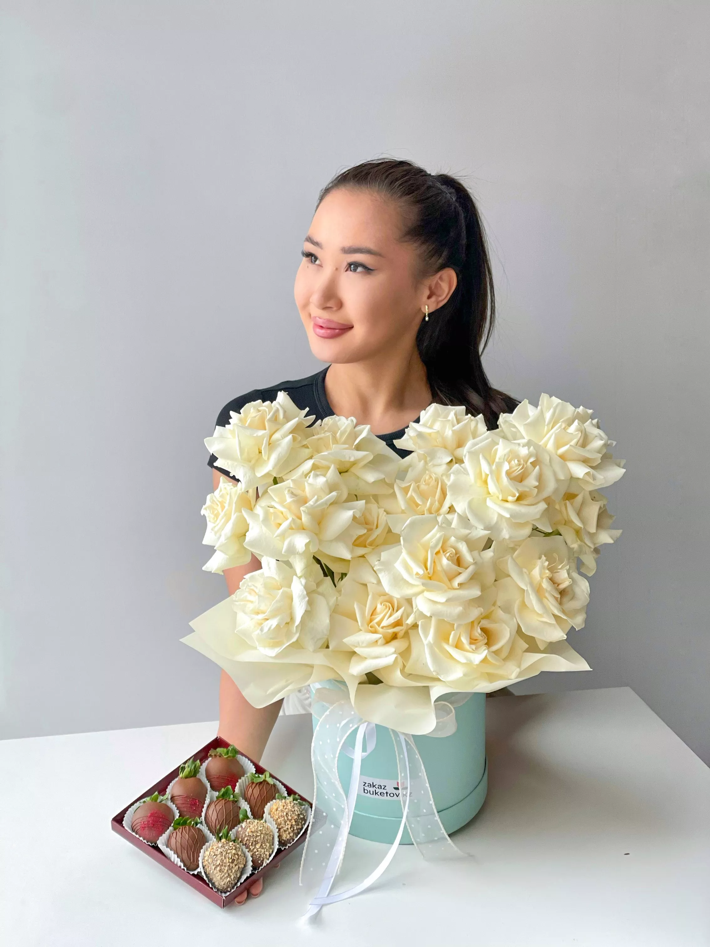 Чудесный сет из клубники в шоколаде и композиции из голландских роз в коробке. Порадуйте своих любимых!