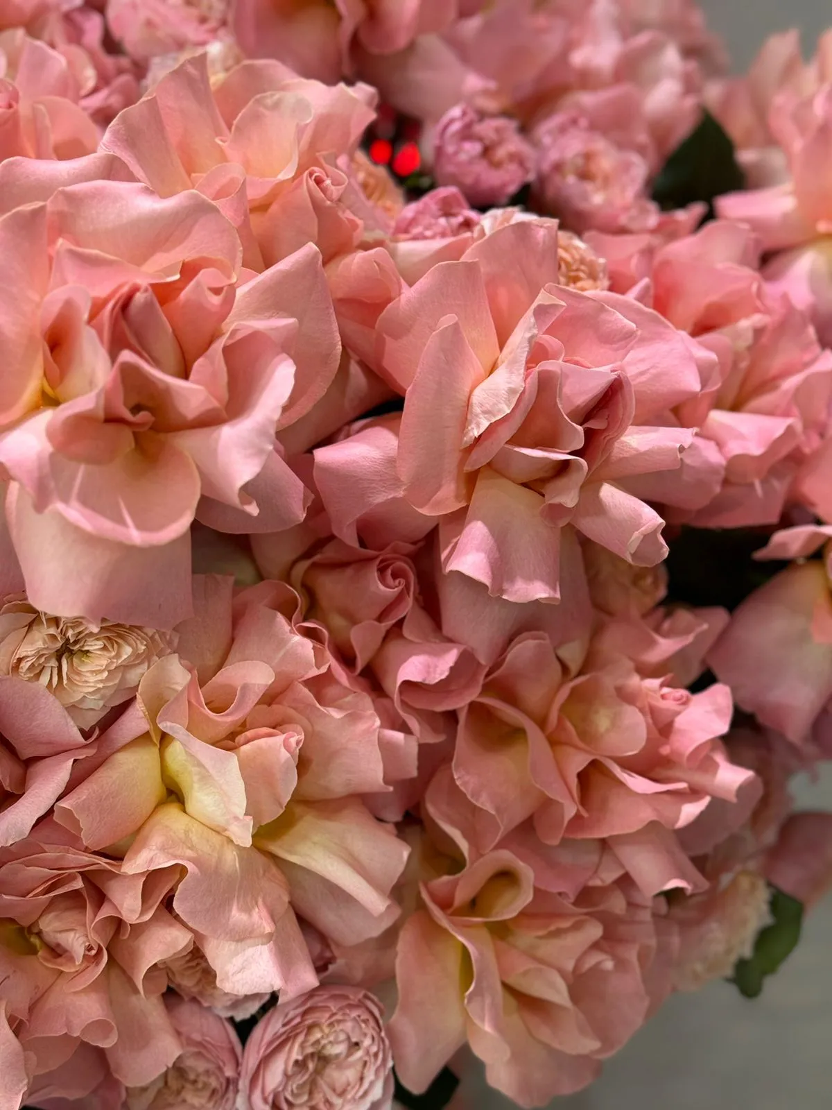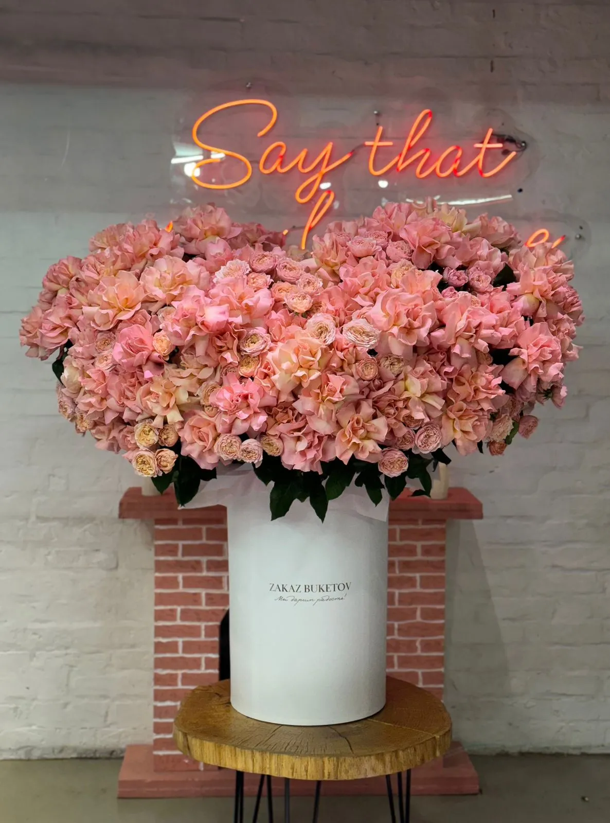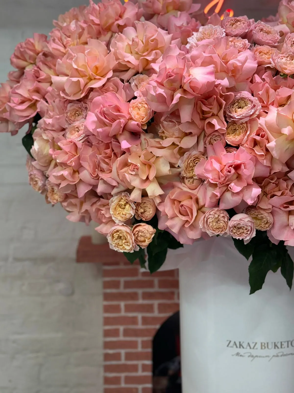 Роза голландская 80 см (+70 см) - 101; Спрей роза пионовидная (Кения) - 50; Открытка - 1; Коробка гигант Премиум ZB - 1;