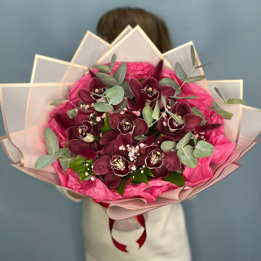 Гипсофила (Голландия) - 1; Орхидея цимбидиум (Голландия) - 7; Эвкалипт (Голландия) - 4; Рускус (Голландия) - 10; Лагурус (Голландия) - 9; Калька в ассортименте - 4; Открытка - 1; Шпажка для открытки - 1;