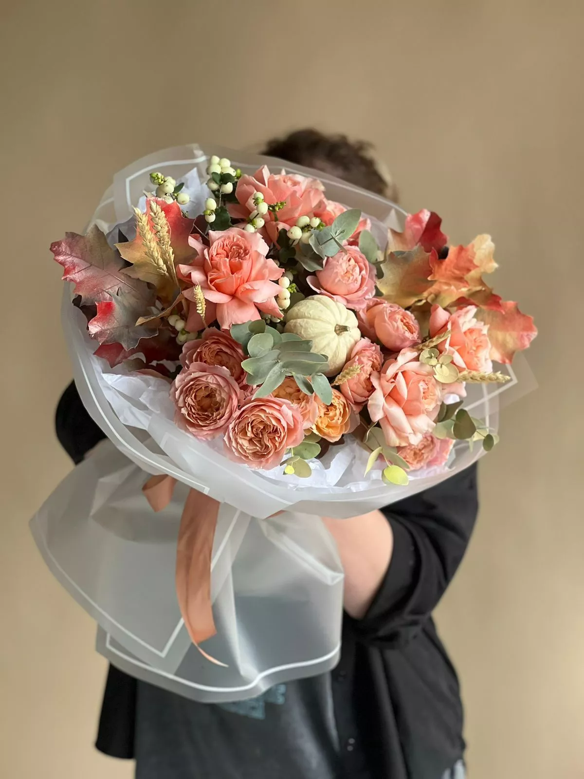 Роза голландская 60 см - 5; Спрей роза пионовидная (Кения) - 5; Кукурбита (Голландия) - 1; Эвкалипт (Голландия) - 1; Симфорикарпус - 1; Кверкус - 2; Пшеница (Голландия) - 1; Калька в ассортименте - 4; Открытка - 1; Шпажка для открытки - 1;
