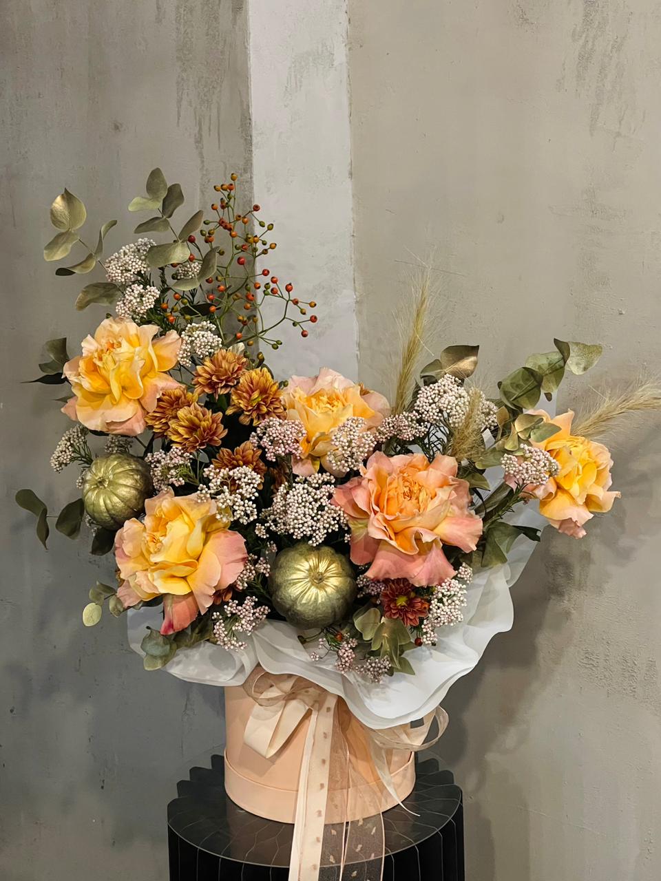 Композиция в коробке "Декаданс" из роз, хризантем и сухоцветов в осеннем оформлении. Если Вы хотите подарить незабываемые эмоции дорогому человеку — закажите доставку цветов в Zakazbuketovkz
