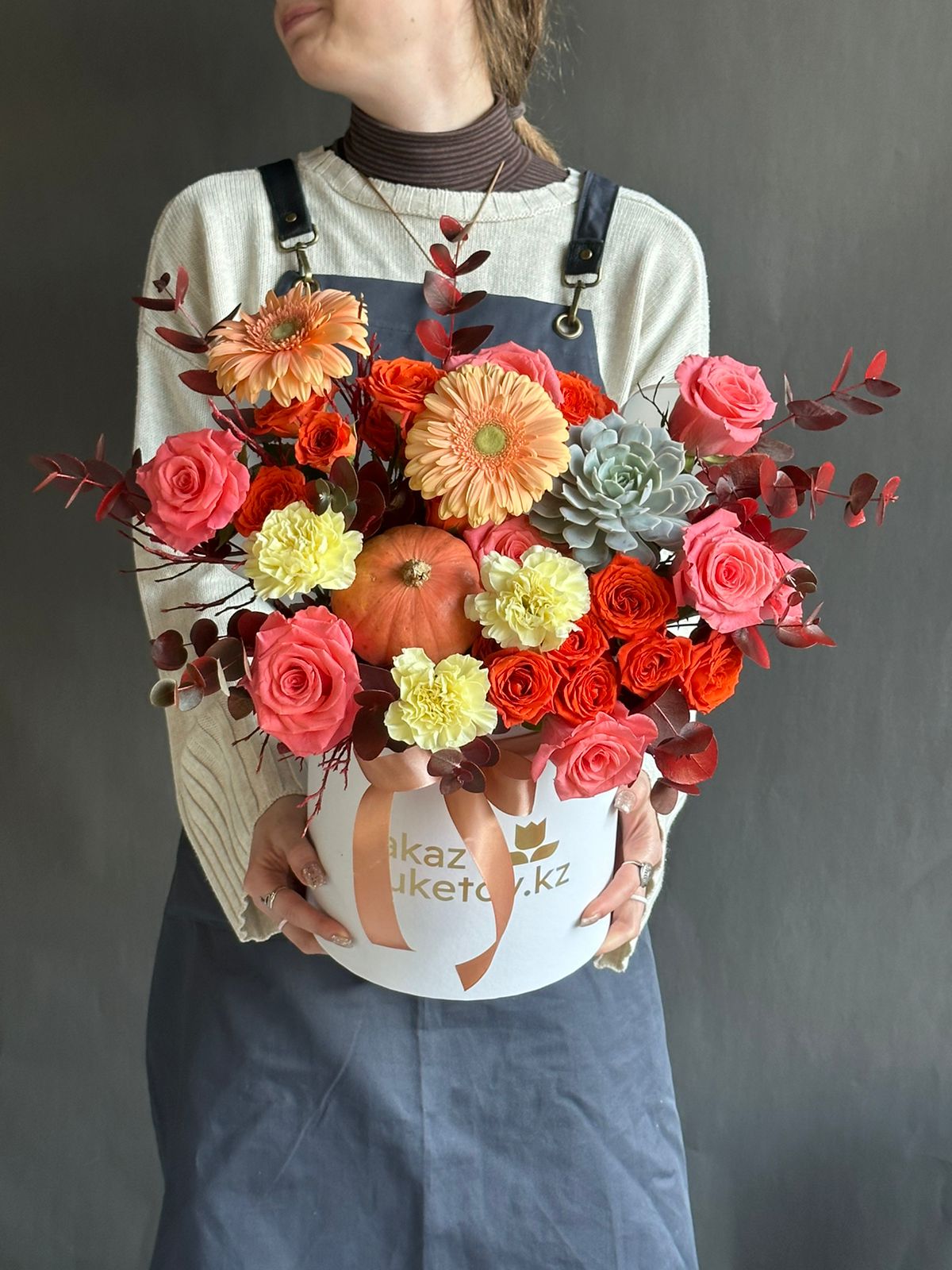 Кукурбита (Голландия) - 1; Гербера (Голландия) - 2; Эйчеверия (Каменная роза, Голландия) - 1; Гвоздика (Голландия) - 3; Роза голландская 60 см - 7; Спрей роза (Кения) - 3; Эвкалипт (Голландия) - 1; Коробка Cтандартная (из комплекта 2в1) - 1; Открытка - 1; Шпажка для открытки - 1; Вакциниум заснеженный - 1;