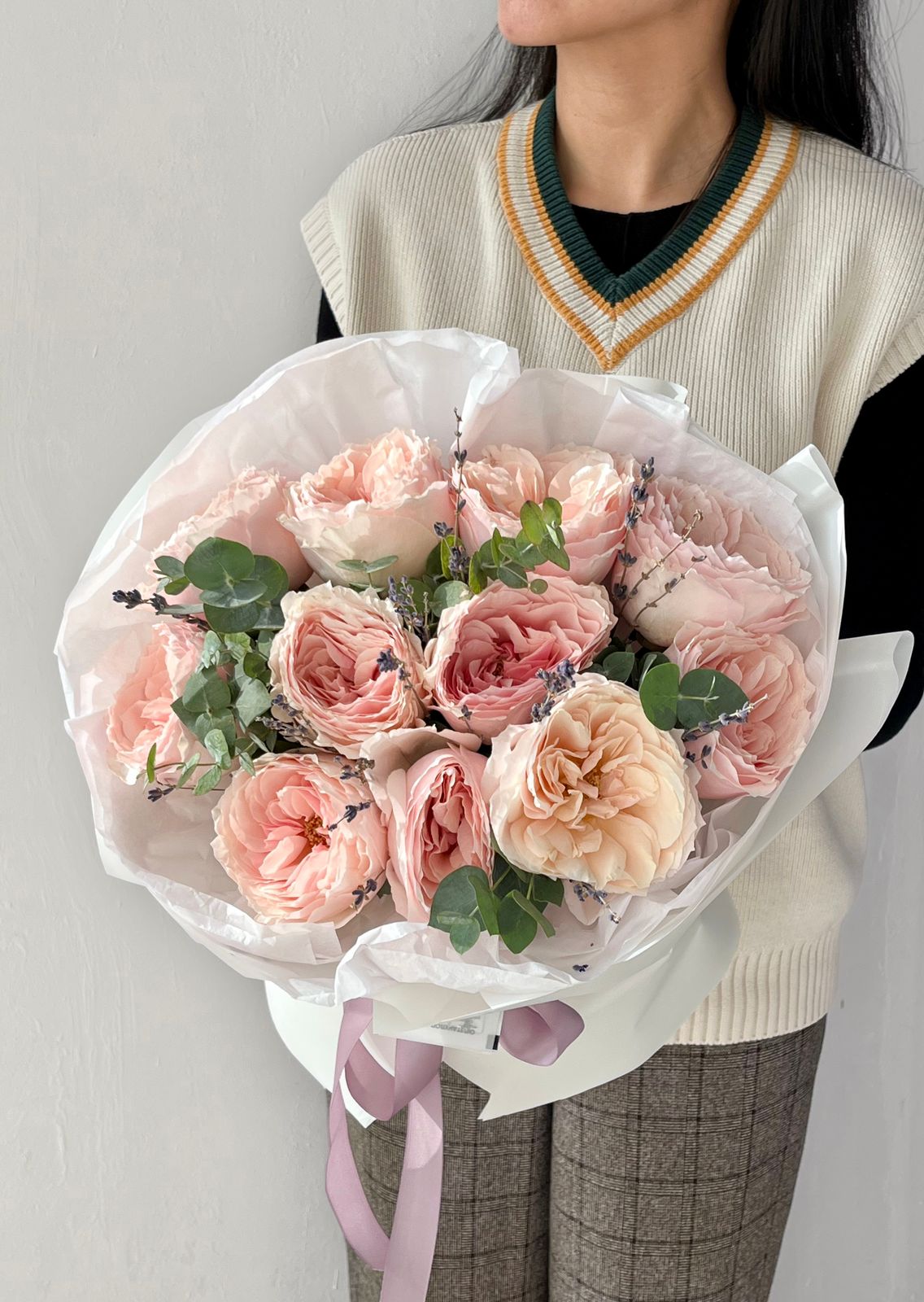 Пионовидная роза (Англия) - 11; Эвкалипт (Голландия) - 1; Калька в ассортименте - 4; Лаванда (Голландия) - 0.5; Открытка - 1;