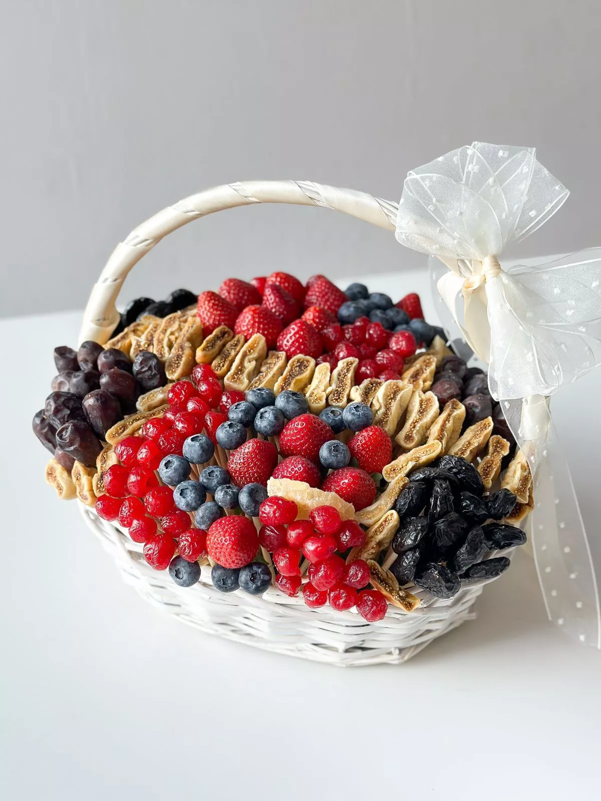 Эта корзина представляет собой великолепное сочетание свежих ягод и ароматных сухофруктов. В ней гармонично сочетаются сочная сладость свежих ягод с интенсивным вкусом и полезными свойствами сушеных фруктов. Эта композиция — настоящий праздник вкуса и аромата, созданная для того, чтобы радовать и угощать в особенные моменты.