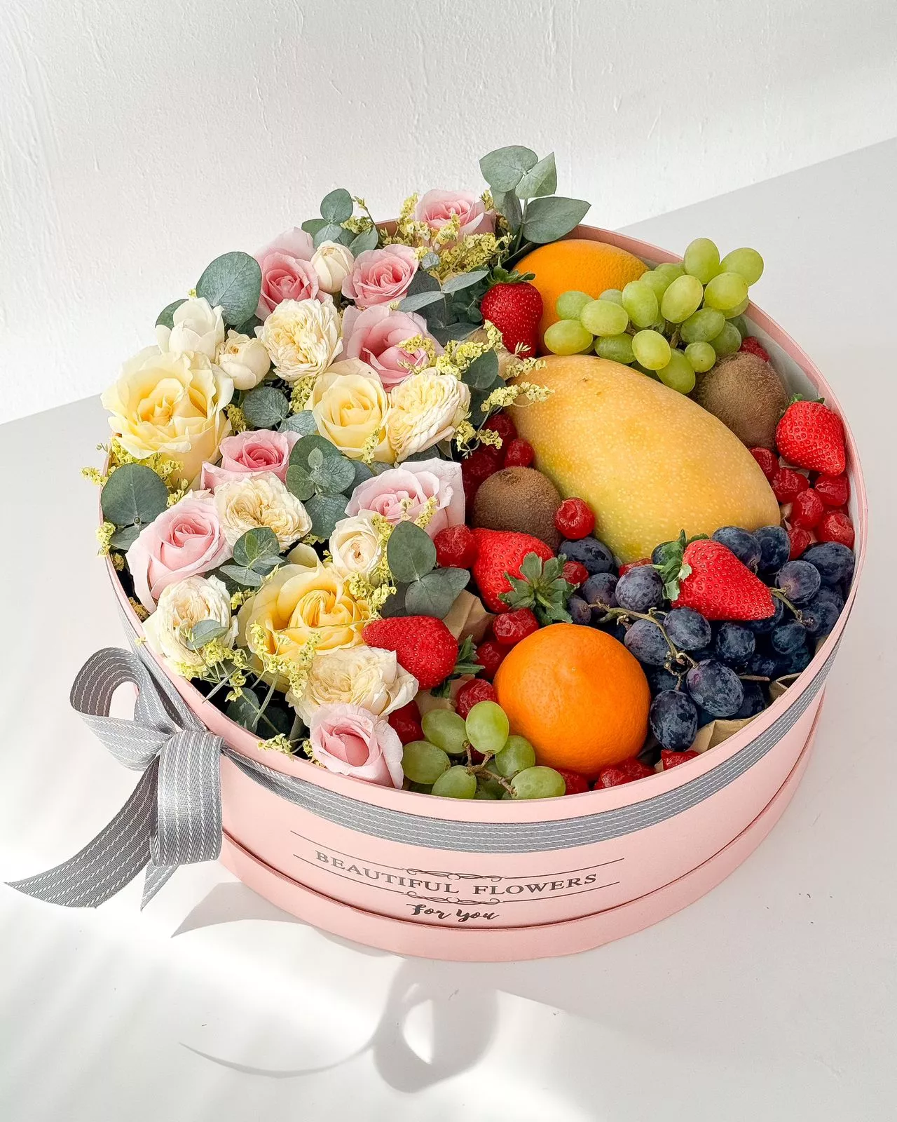 Композиция из роз и тропических фруктов — это яркий и необычный подарок, который придётся по вкусу любому. В ней нежные розы сочетаются с сочными экзотическими плодами, такими как ананас, манго, папайя и киви. Эта композиция станет прекрасным украшением интерьера и подарит ощущение свежести и радости.