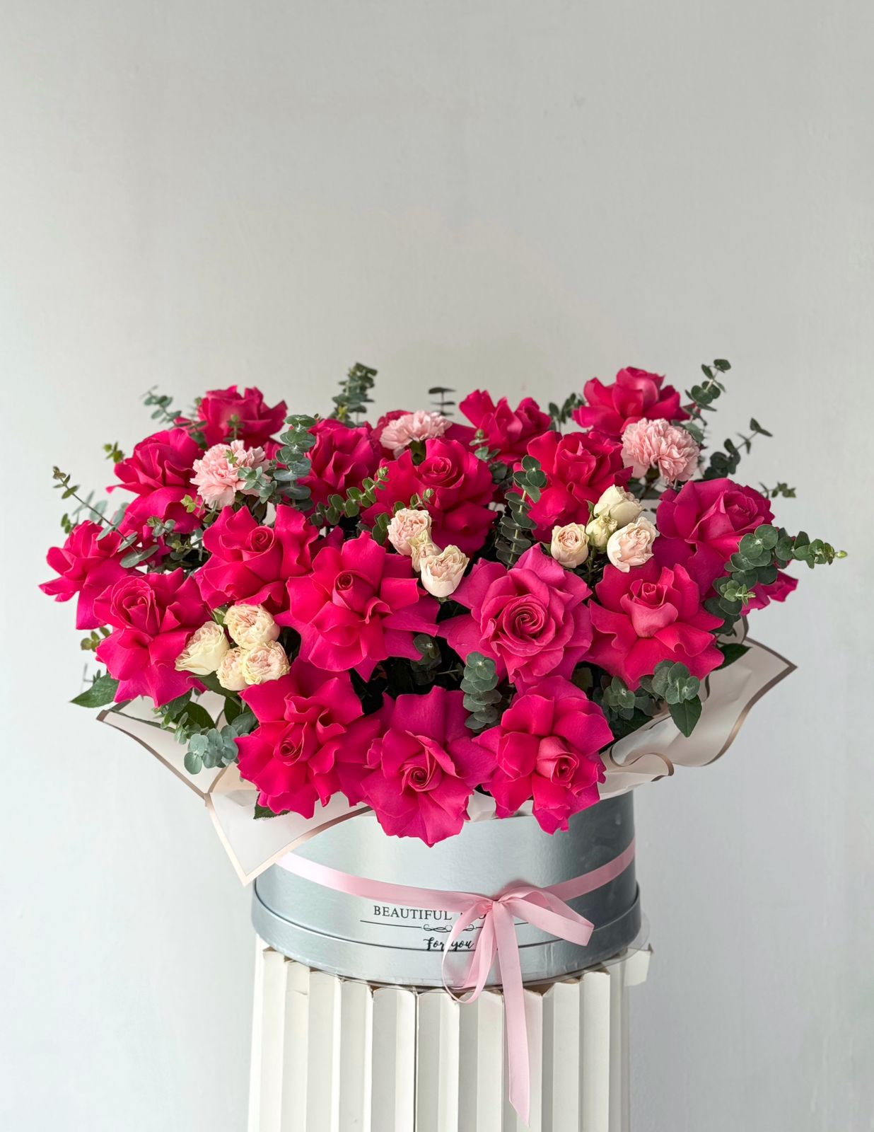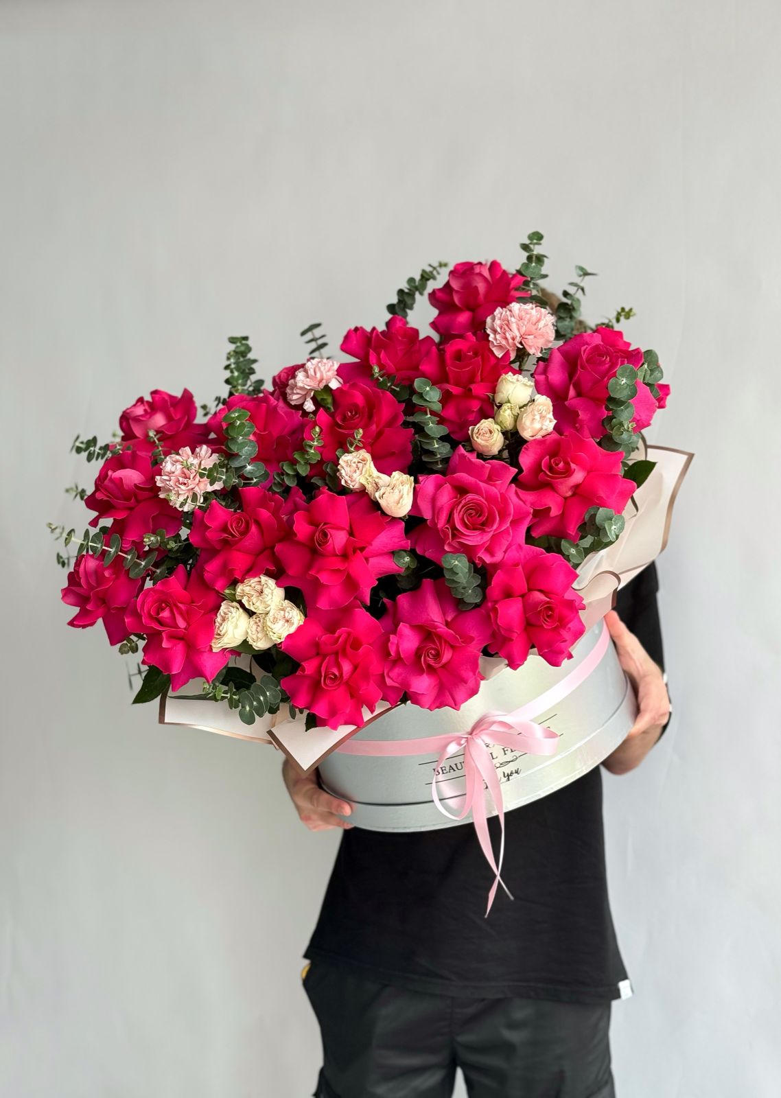 Композиция из гвоздик, роз и эвкалипта в коробке — это стильный и оригинальный подарок, который подойдёт для любого случая. В ней гармонично сочетаются яркие краски гвоздик, нежность роз и свежесть эвкалипта. Эта композиция станет прекрасным украшением интерьера и подарит радость и хорошее настроение.