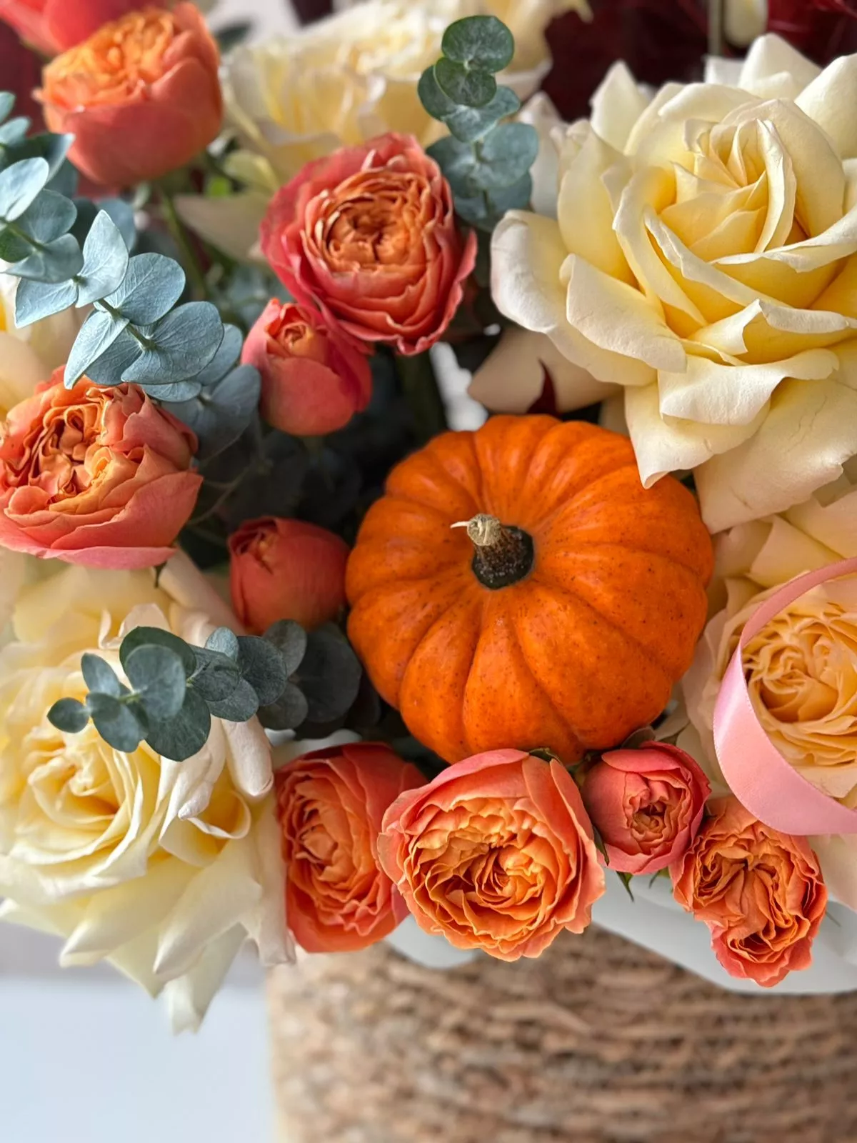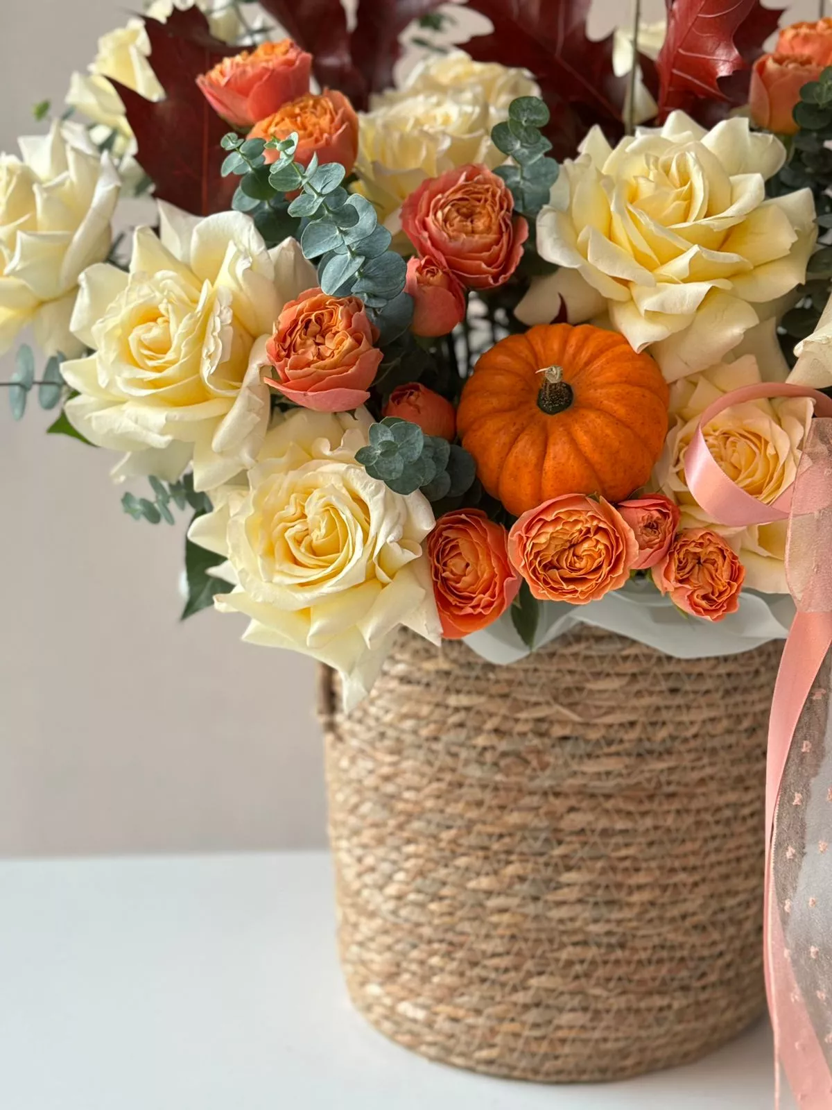 Композиция «Элоди» состоит из роз, кукурбиты и осенних листьев. Этот букет станет прекрасным подарком и создаст атмосферу уюта и тепла.