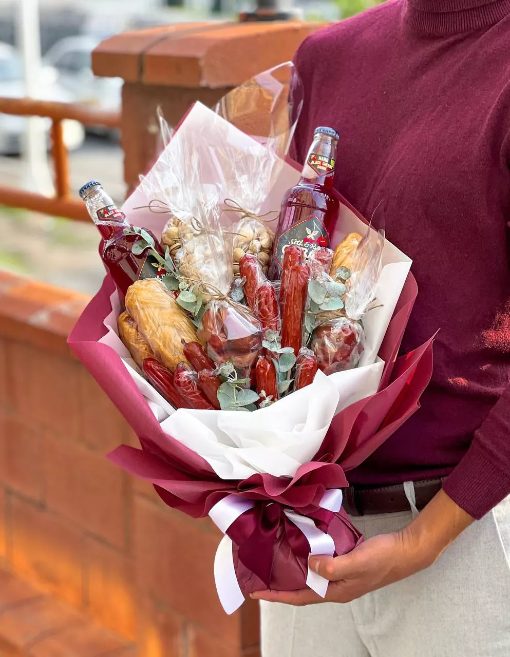 Мужской букет Винсент с чипсами, орешками, чечилом, колбасками и пивом в стильном оформлении вызовет улыбку у ценителей пива.