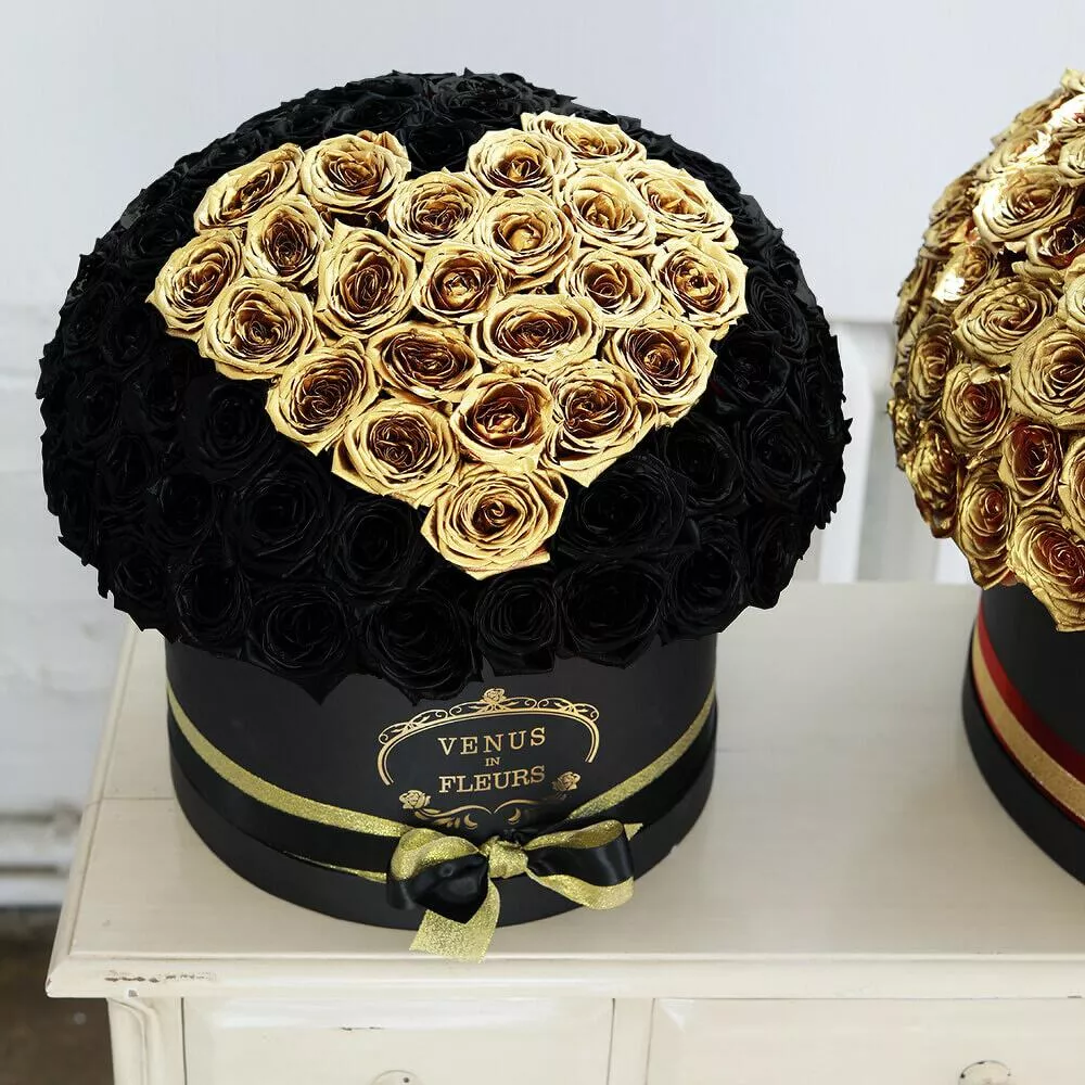 Букет из черных роз с золотым сердцем в коробке - это стильно, элегантно и необычно. Такая композиция станет шикарным подарком как для женщины, так и для мужчины. Розы покрыты специальной флористической краской.